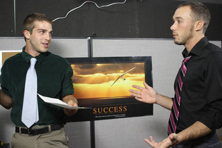 Shane Frost has been working very late, and when his colleague Trevor Bridge finds him in the wee hours of the morning, he also finds a guy with a bulging morning glory who needs a little attention. It's a good thing Trevor's a team player when it comes to his department, he's eager to help a buddy in need.
